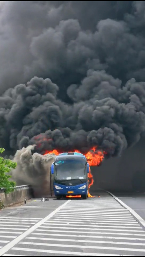高速交警湖州支队父子岭卡点大队民警在接警后,迅速和消防部门一起赶到现场,没过多久将大火扑灭。但此时的大巴车,已经被烧成了一个“铁架子”,无法继续行驶。
