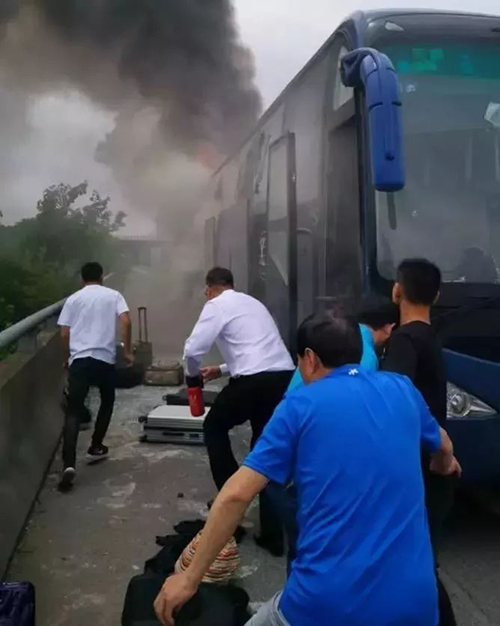 王晓龙找到车里备用的灭火器向大巴车里冲去