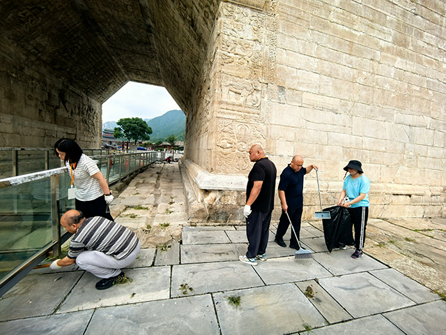 云台内外雕刻有极为精美的佛教造像,洞壁上刻有梵文、藏文、汉文、西夏文、八思巴文、回鹘文,是研究宗教历史最重要的遗存。由于石质文物露天存放,受自然环境影响极大,保护工作更为重要。“突击队”将云台纳入常态化巡护内容,定期组织清除石缝中的青苔、杂草以及各种垃圾。此外,他们发挥工作优势,携手北京建筑大学、北京联合大学等研究机构发起的云台价值阐释项目和保护利用规划项目,为居庸关云台的石刻保护、科研、展示、教育及虚拟博物馆建设等奠定深厚基础。