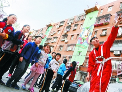 在石景山区四季园社区的春园内,来自石景山区师范附幼和师范附小的孩子们日前指着墙上的图案兴奋地讨论着。原来,这是四季园社区“春园”举办的用涂鸦艺术扮靓社区的活动,来自海峡两岸的16名青年设计师带领40余名小朋友共同体验涂鸦的魅力,用艺术创新创作让老旧小区焕发新颜,共建共享具有艺术氛围的美丽社区。
