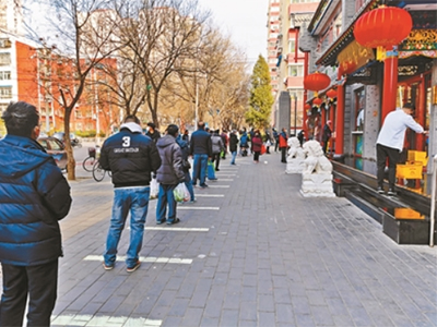 图为2月26日上午,朝阳区农光里社区附近,几十家商铺在门前地面上画起了一米线,市民有秩序地在一米线外排队购物。汪震龙 摄