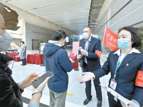 3月2日,在海淀中关村西区中国电子大厦,由楼宇物业负责人和街道下沉干部组成的双楼长值守岗位,协助检测进入人员体温,提示大家严格保持一米间距。北京日报记者 饶强 摄