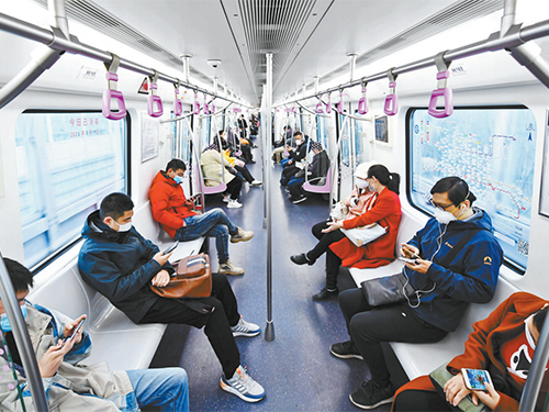 3月24日,为做好疫情防控期间地铁运营保障工作,降低列车拥挤情况,北京地铁昌平线、八通线先行在工作日使用超常超强运行图,昌平线最小行车间隔由3分40秒缩至2分,八通线最小行车间隔由2分50秒缩至1分58秒。图为乘客乘坐地铁昌平线出行。文并摄/新华社