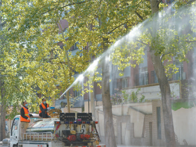 4月13日,海淀区绿化三队工作人员对海淀个别杨柳树雌株飞絮明显的路段进行喷水喷湿作业,减少飞絮影响。北京日报记者 王海欣 摄