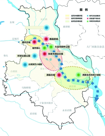 在空间布局方面,提出了“一河、三区、多点”的发展格局。“一河”即以大运河河道及两侧为大运河文化带规划主体部分。“三区”即运河水城展示区、运河文旅体验区和运河生态观光区。“多点”:一是时代文化创新点,主要包括宋庄艺术创意小城镇、台湖演艺小城镇、张家湾设计小镇、环球影城主题公园等;二是历史遗产传承点,主要包括通州古城、路县故城、漷县古城、张家湾漕运古镇等;三是休闲文化体验点,主要包括西集生态休闲小城镇以及张庄村、儒林村、马头村等一批特色古村落等。