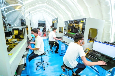 6月21日下午,记者来到正在紧张施工的场地内。九个高3米、占地65平方米的白色气膜仓,按照实验流程被分为三组,工作人员正在对内部设备进行最终调试。三天前,这里还是块篮球场。相比较传统实验室,气膜式实验室的搭建速度快很多,为一个气膜仓充满气,只需要50分钟。“仓内采用模块化布局,设备到了直接组装即可,而且还为后续发展预留了空间,实现定制化升级。”现场负责人刘心说,待疫情消散,三组气膜实验室能够在半天时间内撤出,快速恢复场地原貌。