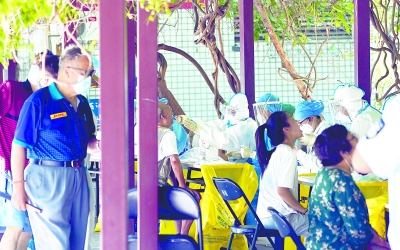 6月22日,东城区新景小区西区的居民在西区小广场绿植长廊的临时核酸检测点进行检测。北京日报记者 刘平 摄