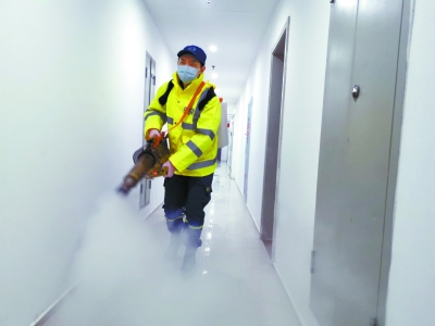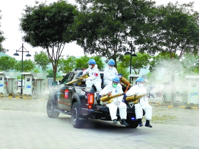 “牛栏山”说,大家没有过多的言语,在集合整队,培训和演示弥雾枪使用规范及操作要点后,两两一组,开始对336路公交总站大峪车场进行全面的消杀。