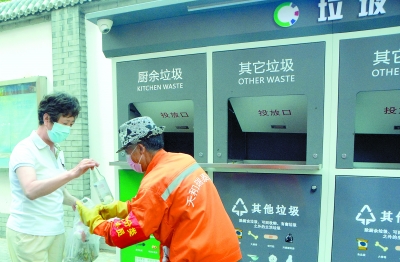 丰台区长辛店街道东山坡社区15号院的封闭式垃圾分类投放桶站近日投用。桶站每天上午7点至9点、下午6点至8点开放,垃圾分类分拣员在桶站旁提醒和协助居民分类投放垃圾。北京日报记者 刘平 摄