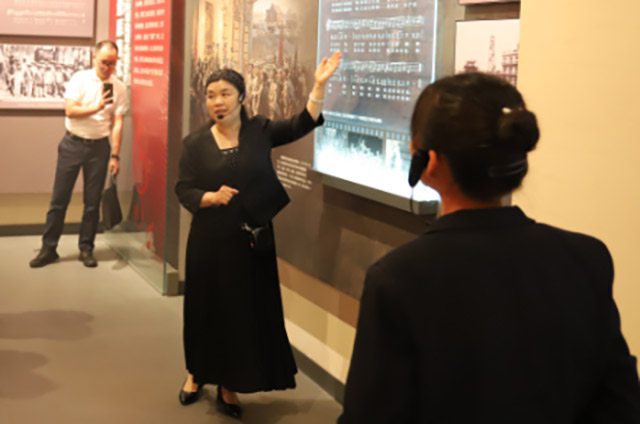 为让讲解既有温度又有深度,她一头扎进史料堆——翻党史文献、查歌曲创作背景,对着乐谱逐句练唱革命歌曲,哪怕一个音符的情感表达,都要反复琢磨。耗时两个月,她终于打磨出独具特色的专属讲解词——既有历史厚重感,又有音乐灵动性。在“人民的心声 历史的旋律”主题展中,她不会直陈列展,而是笑着向游客发出邀请:“同志们,当年的劳动号子就是这样为战士们加油鼓劲的,我们一起试试看,把这股劲儿唱出来!”随即,她便领着游客齐声高唱“千家万户哎嗨哎嗨呦,把门开哎嗨哎嗨呦……”歌声落定,展厅里总会爆发出热烈的掌声。一位游客由衷感叹:“太震撼了!光是听讲解,可能记忆不深刻,但这样亲口唱过歌,艰苦奋斗的历史一下子就‘活’了起来,感受很深刻!”