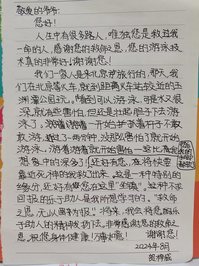 被救的是一个12岁女孩,跟家长从深圳来北京旅游。天气炎热,逛公园时,孩子本想下湖游泳解暑,可因为不了解八一湖的水域情况,不小心发生了意外。家长看到平安无事的孩子,激动得泣不成声,紧紧握着许树起的手,一个劲儿地表达感谢。许树起表示:“这算是我和孩子的缘分,不需要感谢。让孩子好好学习,长大以后报效祖国,就是对我最好的感谢了。”