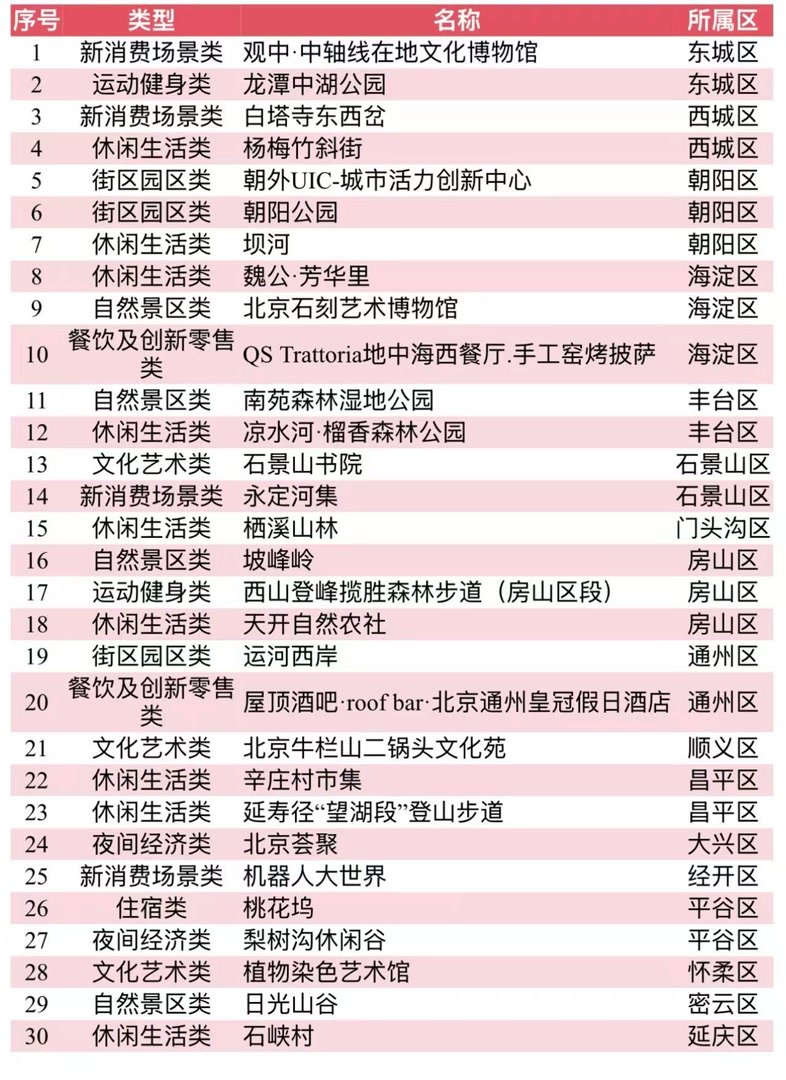 作为城市活力中心,朝外UIC-城市活力创新中心、朝阳公园、运河西岸等地标,共同组成了街区园区类打卡地。南苑森林湿地公园、坡峰岭、北京石刻艺术博物馆和日光山谷,为人们提供了亲近自然的去处,归入自然景区类打卡地。龙潭中湖公园、西山登峰揽胜森林步道(房山区段)和延寿径“望湖段”登山步道属于运动健身类打卡地……这30处打卡地为市民游客提供了丰富、立体的休闲选择。