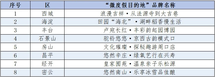 同时,市文旅局还发布了第三批共8个“北京微度假”目的地品牌,分别是:“浪漫吉祥·从法源寺到大吉巷”“田园‘海北’·湖畔稻香慢生活”“卢宛长红·丰彩韵起园博园”“驼铃悠悠·京西古韵模式口”“文化璀璨·探秘趣游周口店”“悠然辛庄·绿氧艺行在兴寿”“皇家囿苑·温泉亲子乐松源”“悠然南山·乐享冰雪品佳酿”。这些适合微度假休闲的旅游片区,拥有文商旅体等多种业态,消费场景多元,各有特色、各有玩法,为市民游客“微旅行”“宅度假”提供了新选择。