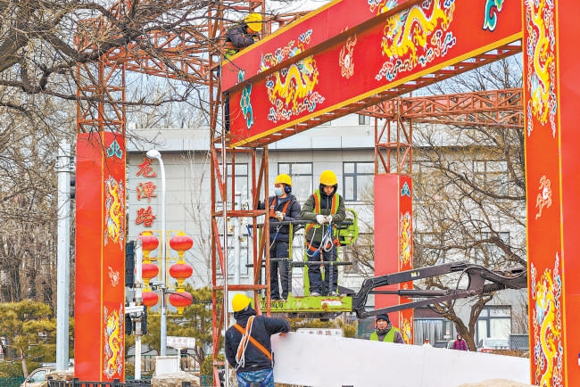 在龙潭公园西北门,工人正在进行新春庙会布置。