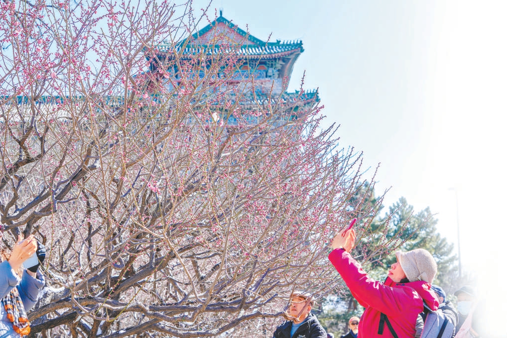明城墙遗址公园里的梅花吸引众多游人。