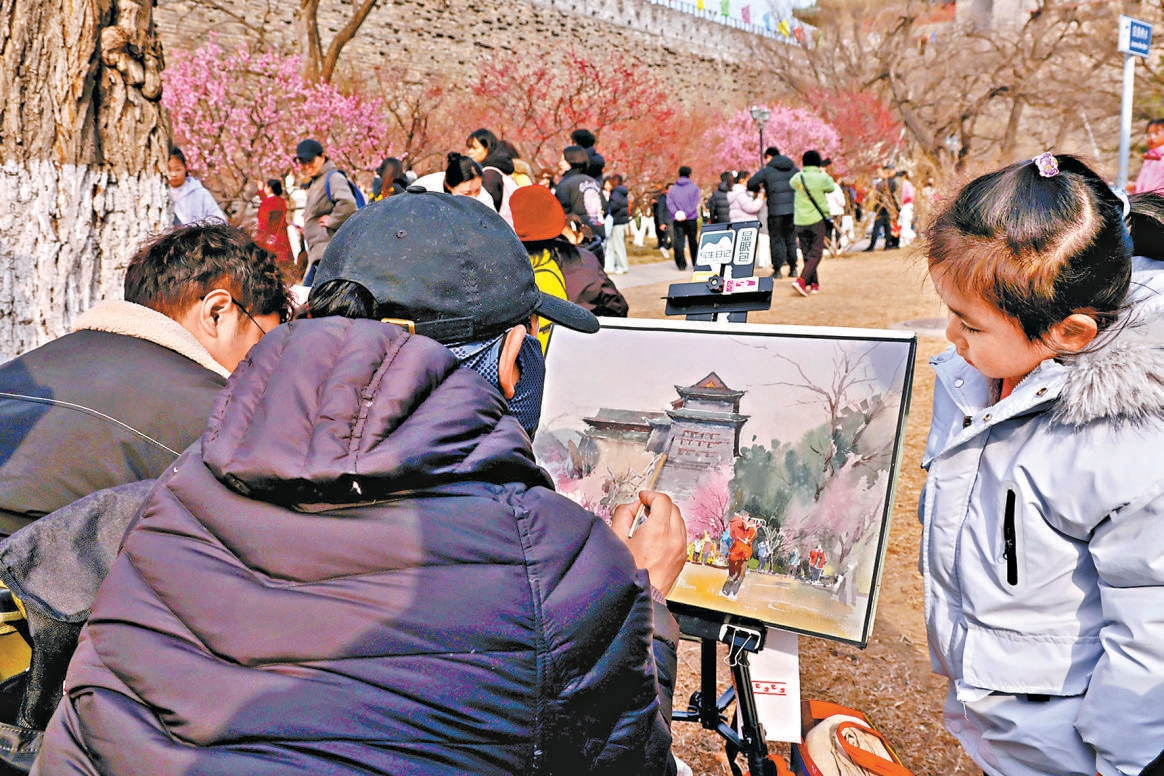 城墙之下、古寺之旁,梅花与群芳相映成趣,摄影绘画爱好者流连其间,以笔墨镜头勾勒春光;花间树下,游人赏景怡情,笑语盈盈,其乐融融。