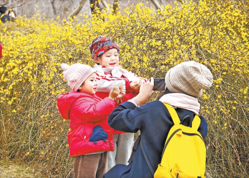 玉渊潭公园迎春花盛放,母亲带着两名孩童在花丛前拍照留念,定格春日里的温情瞬间。 赵乃明 摄
