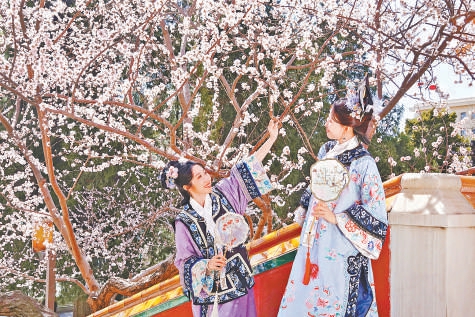 北海公园阐福寺,游客身着汉服踏青赏花,在花影与红墙间感受春日诗意。杨一良 摄