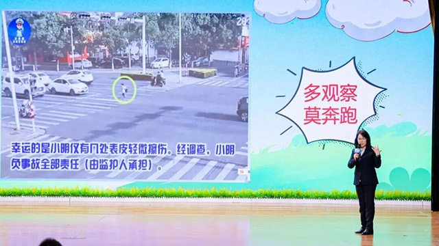 活动开始,向同学们介绍“斑马线”的由来与变迁,从源头上强化小学生群体对“礼让斑马线”意义的理解;双簧表演《知危险 说安全》将“随意横穿斑马线”“闯红灯”等放学路上的危险场景融入趣味故事,以幽默诙谐的语言深化小学生对遵守交通规则重要性的认知;《安全课堂》以“人类感知与交通安全”为题,让小学生直观感受交通安全中的认知盲区,提醒日常出行中要绷紧安全弦;案例教学环节,邀请市交通安全宣讲团讲师紧贴交通事故案例,现场传授步行、骑车、乘车等交通安全知识常识;学生代表带来的主题朗诵《文明礼让小卫士》,声情并茂地传递出他们对构建文明交通环境的憧憬向往。