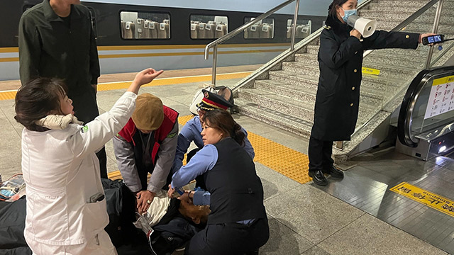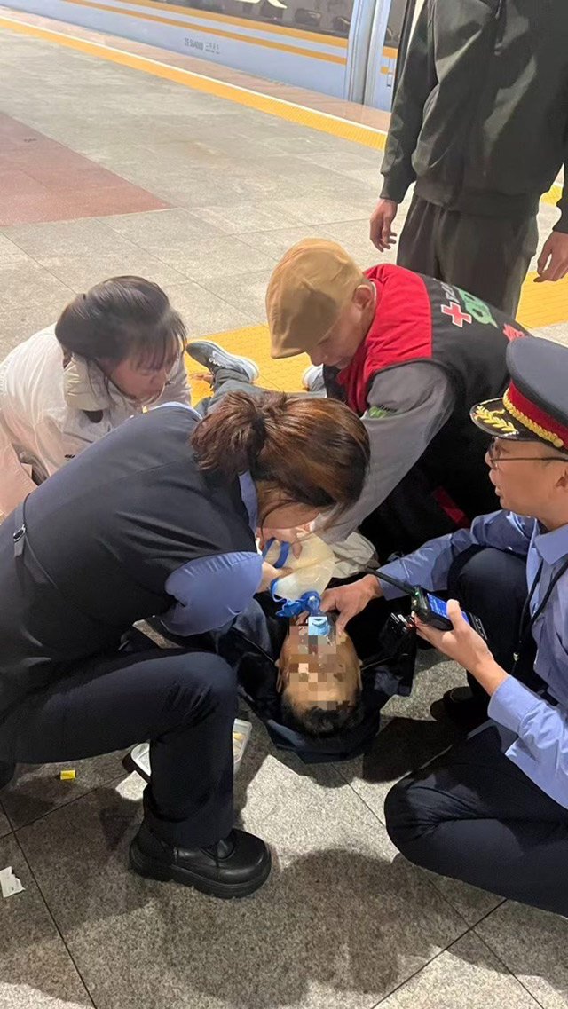 “抓紧到34A南头来……”不远处,正在组织旅客乘降的客运员武志广听到对讲机里的呼叫,第一时间冲到事发现场。“当时看到一名旅客躺在扶梯上,我和同事加上一位热心旅客,合力把他抬到几米外更宽敞的站台上,方便救助,也不影响其他旅客正常通行。”