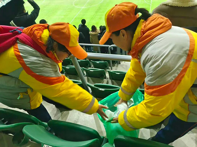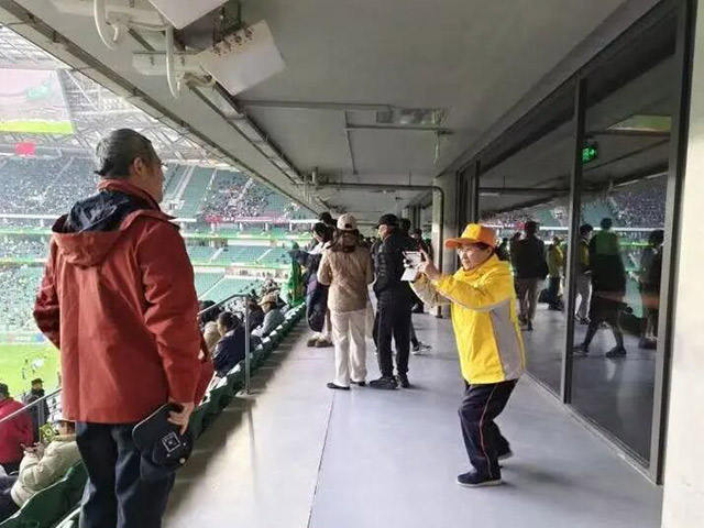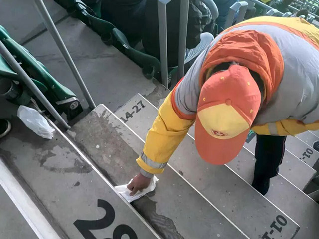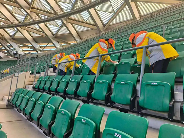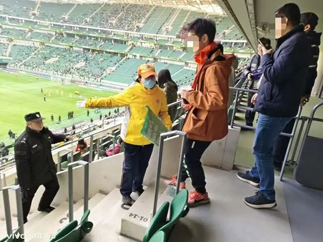 开赛前,引导员们提前进入看台,擦拭座椅和扶手,为球迷营造整洁的观赛环境。随着观众陆续入场,他们耐心解答询问,指引观众快速落座,确保数万球迷能够有序入场,避免拥堵。