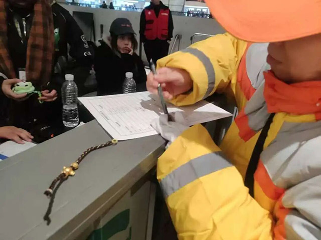 比赛结束后,引导员们守在通道旁引导观众有序离场,并清理遗留在座位区的垃圾,确保“人走场净”,在引导员的带动下,球迷朋友也主动将垃圾投放到垃圾袋中。在清理的同时,引导员还留心检查座位上是否有球迷遗落的物品。通州区引导员在座位下发现一条遗落的手链,因未寻到失主,引导员将手链交到赛场失物招领处,方便失主回来寻找。“柠檬黄”们还在地铁站等重点区域提供路线指引,协助疏散球迷,有效缓解了周边交通压力。