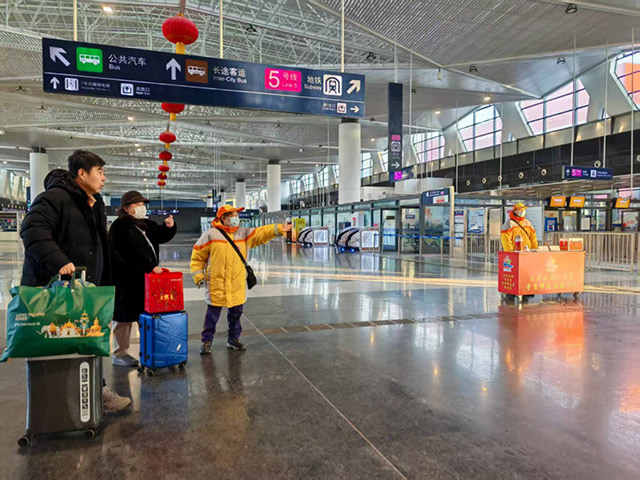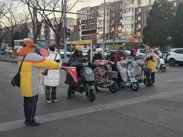重点交通路口、公交地铁站台的早晚高峰,总有“柠檬黄”坚守在岗!他们为礼让斑马线的司机师傅点赞,提示行人遵守信号灯,还主动搀扶老人过马路、帮乘客搬行李。在天通苑北交通枢纽大厅,他们设立志愿服务岗,提供轮椅、急救箱、热水等便民物资,让出行之路满是暖意。