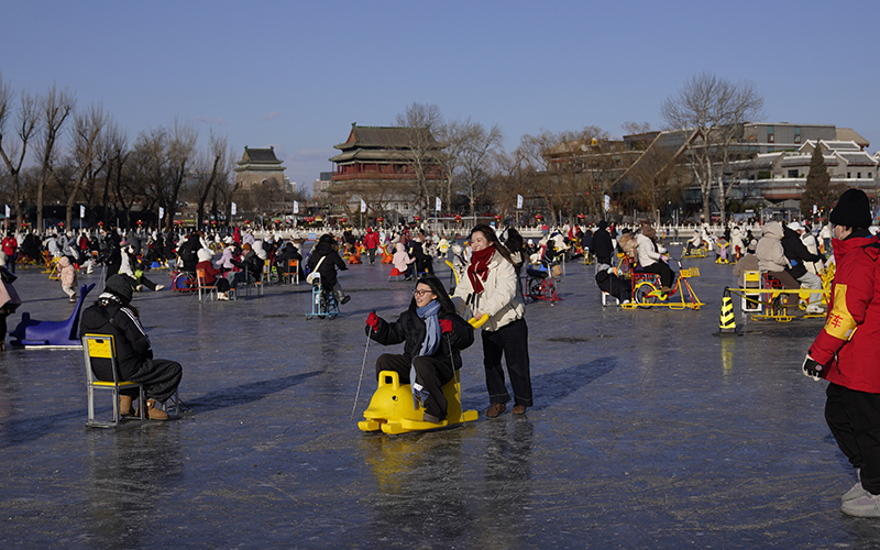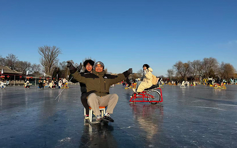 随着阵阵欢声笑语,记者注意到,一群穿着亮色羽绒服的孩子挑选好心仪的冰车,便迫不及待的追赶着冲向冰场中央。在冰场的另一侧,也有游客驾着冰车靠近灵动的蓝色飞马雕塑,拍下与冰面、骏马、鼓楼同框的大片,将京城地标与冬日里的欢乐同框定格。