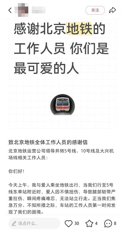 这份全力以赴的守护,也深深印在了乘客心中。乘客在感谢信中动情写道:“5号线的热情相助,到换乘站的无缝对接,让我们真切感受到北京地铁的温度与效率。”简单的话语,字里行间满是真挚谢意,更是对北京地铁工作人员主动担当、全程相伴的最好认可。