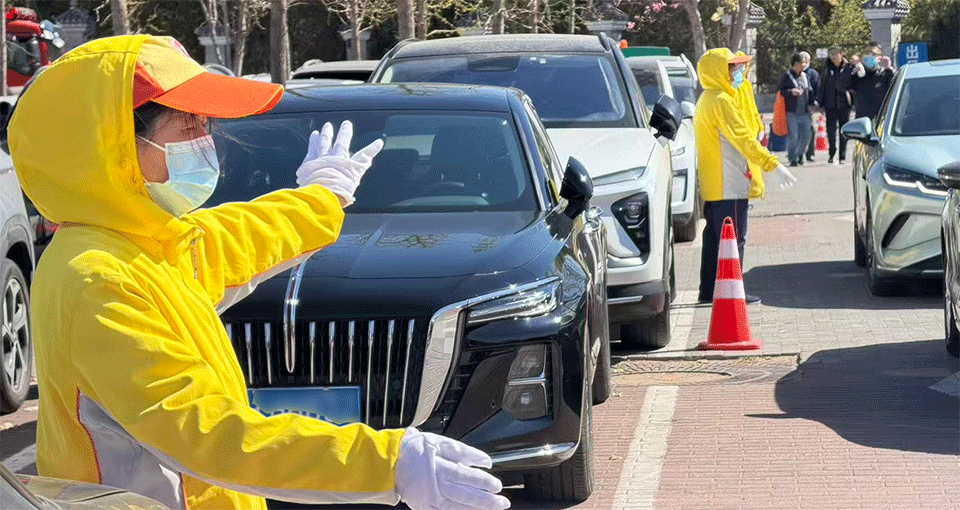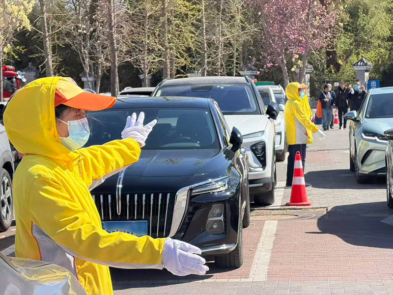 “您稍等……请您这边先行!”在思亲园公墓停车场的入口,文明引导员正在引导车辆有序停放。当天风力较大,队长许华提前看了天气预报,在出发前就叮嘱队员要戴好口罩、收紧帽子。大风吹过,队员们没有丝毫松懈,眯起眼睛、提高音量,耐心疏导着车流。在引导员的指引下,现场车辆的通行和停靠井然有序。