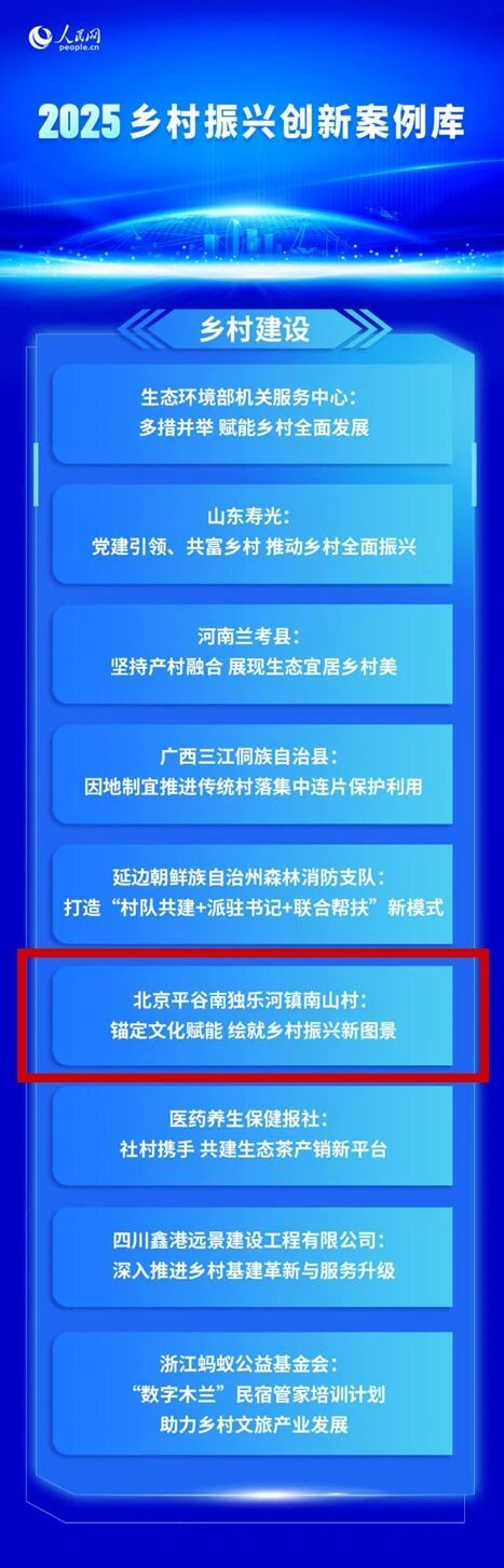 12月6日,由人民网主办的“2025乡村振兴大会”在北京隆重召开,大会以“数字赋能 城乡融合 加快农业农村现代化”为主题,汇聚全国200余名地方政府代表、专家学者及乡村振兴领域企业代表,共话乡村振兴新路径、共展实践新成果,农业农村部有关领导出席致辞。会上发布的《2025乡村振兴创新案例库》传来重磅喜报,平谷区报送的乡村建设案例《北京市平谷区南独乐河镇南山村:锚定文化赋能,绘就乡村振兴新图景》,从全国320个申报案例中脱颖而出成功入选,为“高大尚平谷”建设再添国家级荣誉。
