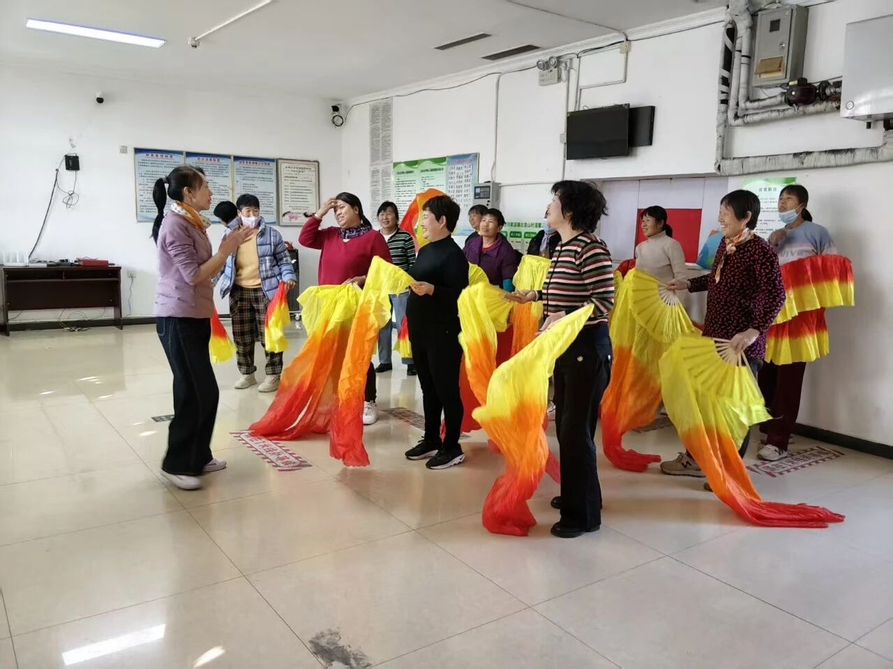 教学过程中,李老师针对村民们基础薄弱的特点,采取“分解动作+慢速跟练+完整合跳”的方式,从站姿、手势到步伐,逐一进行细致讲解和示范。遇到动作不标准的村民,她还会一对一纠正指导。村民们学习热情高涨,跟着老师的节奏反复练习,脸上洋溢着专注又快乐的笑容。