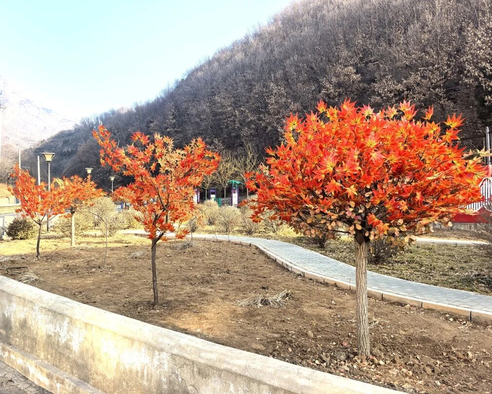 与往年略有不同的是,今年的装扮别具巧思。除了喜庆的红灯笼,村里还巧妙地运用了枫叶元素进行点缀。一簇簇“枫叶”或被悬挂在枝头,与灯笼相互映衬;或被布置小广场等醒目位置,红红火火,层林尽染般的视觉效果,为冬日的山村增添了热烈而温暖的色彩,寓意着生活的红火与兴旺。