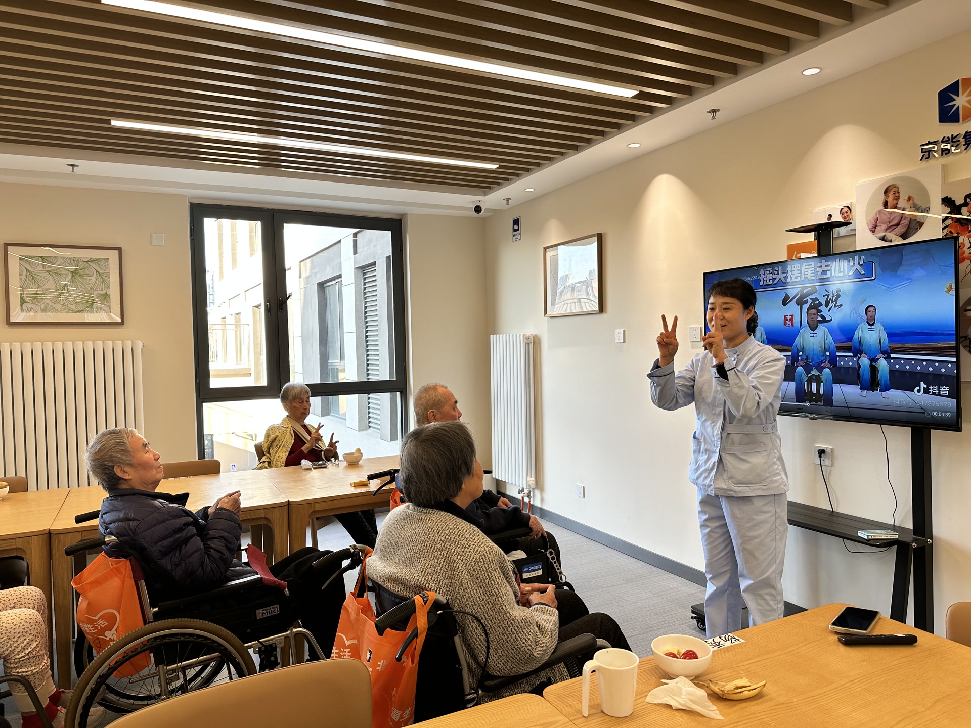 养老服务中心工作人员带领老人做手指操