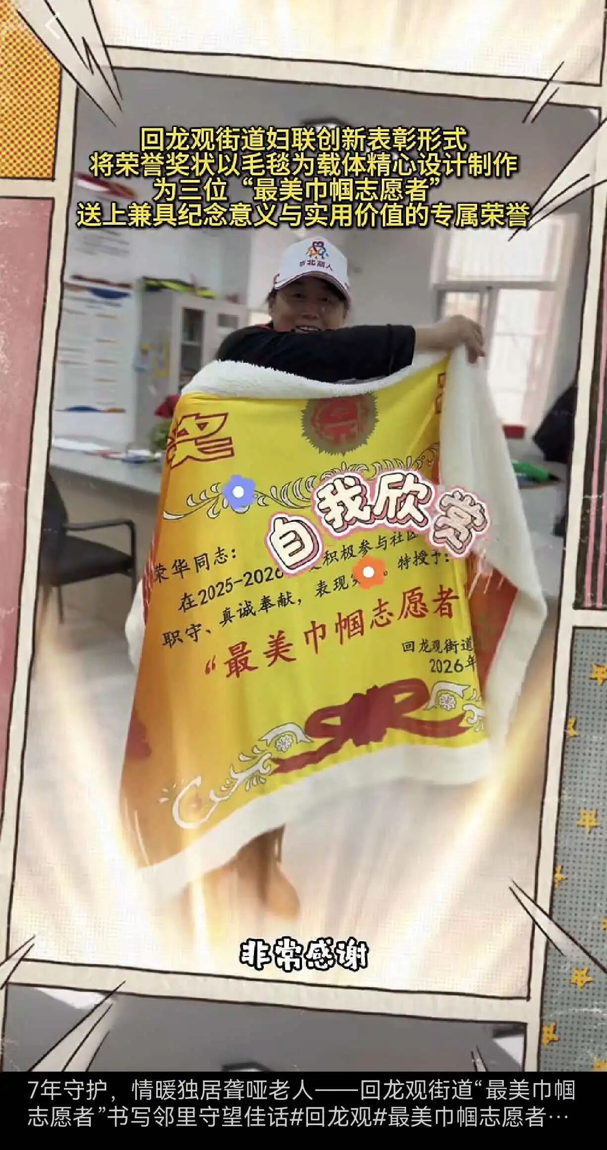 近日,一条回龙观街道拍的短视频在网络迅速走红:画面中,三位社区志愿者收到了一份特殊的礼物——一张用毛毯背面印制的“大奖状”,上面写着“最美巾帼志愿者”几个大字。三人捧着这张“毛毯奖状”,脸上洋溢着幸福的笑容。这看似搞笑的画面背后,藏着一段跨越七年的温情故事。