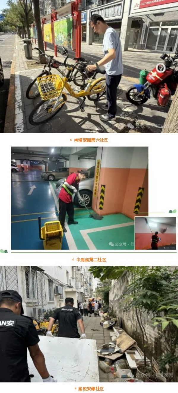 在全面清扫的基础上,本次行动更聚焦群众关切的重点问题,精准发力提升环境品质。一方面,志愿者们化身“文明卫士”,对社区宣传栏、健身器材、休憩座椅等公共设施进行彻底擦拭,让公共空间更洁净;另一方面,针对楼道堆物堆料、共享单车乱停放等影响居住环境与通行安全的问题,工作人员逐一上门沟通,协助居民清理闲置物品,并将乱停放的共享单车有序归位。此外,恋日绿岛社区、鸿博家园第二社区等还在整治过程中向过往居民发放文明提示,呼吁大家摒弃不文明行为,从随手捡垃圾、规范停车等小事做起,共同守护家园环境。