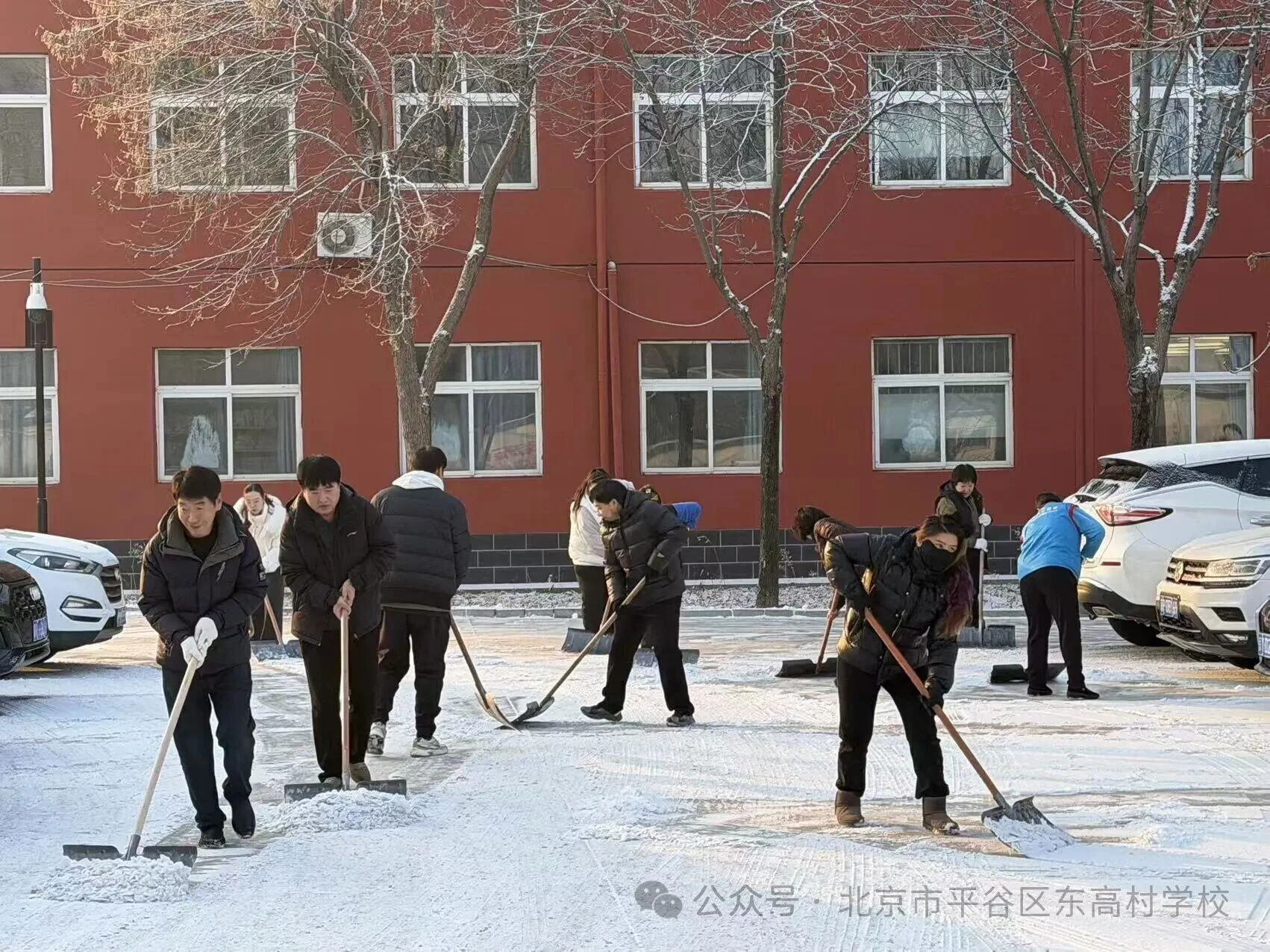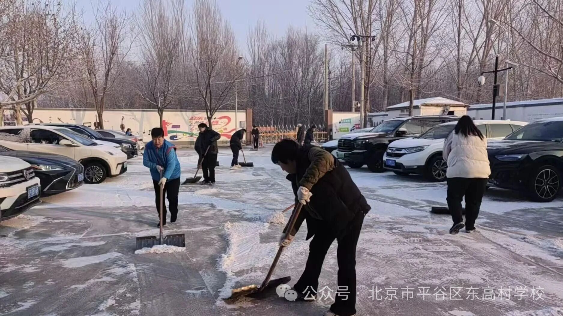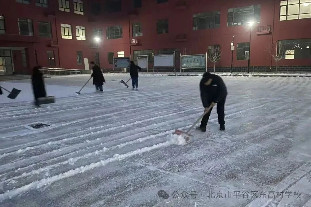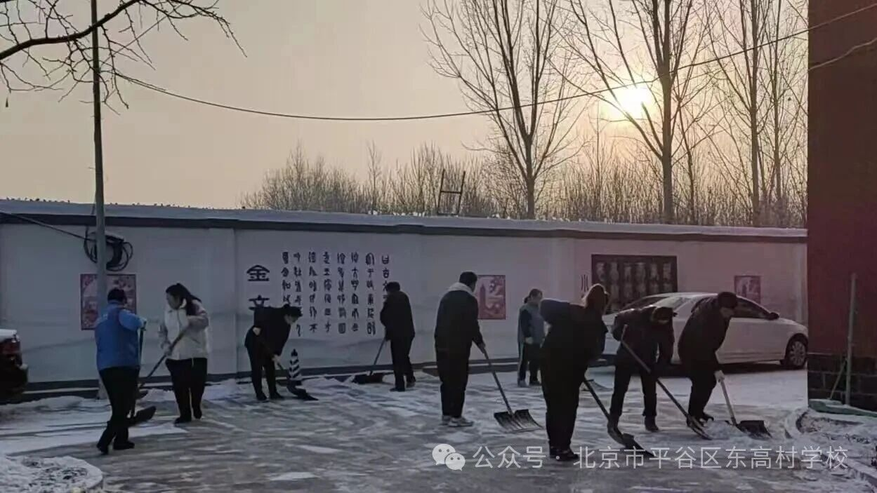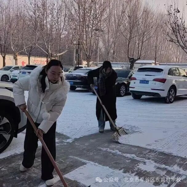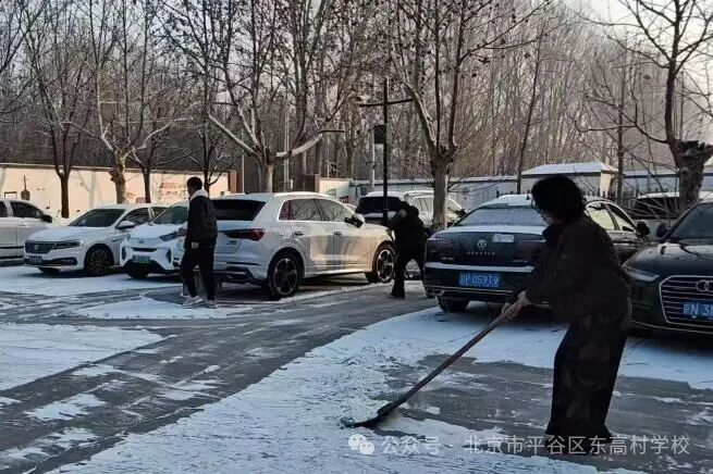 同时,我校党员干部教师、青年教师们也自发集结,铁锹、扫帚齐上阵,积极配合保洁队伍高效清扫停车场、校园干道的积雪。