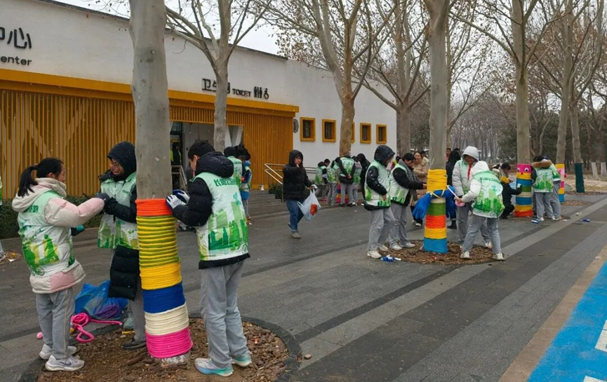 揭牌第一课,就充满了诗意与温度。同学们分组化身“树木装扮师”,手持彩色毛线,细心为园中树木缠绕起独特的“冬日毛衣”,把对自然的关爱,编织进这件“冬日新衣”里。