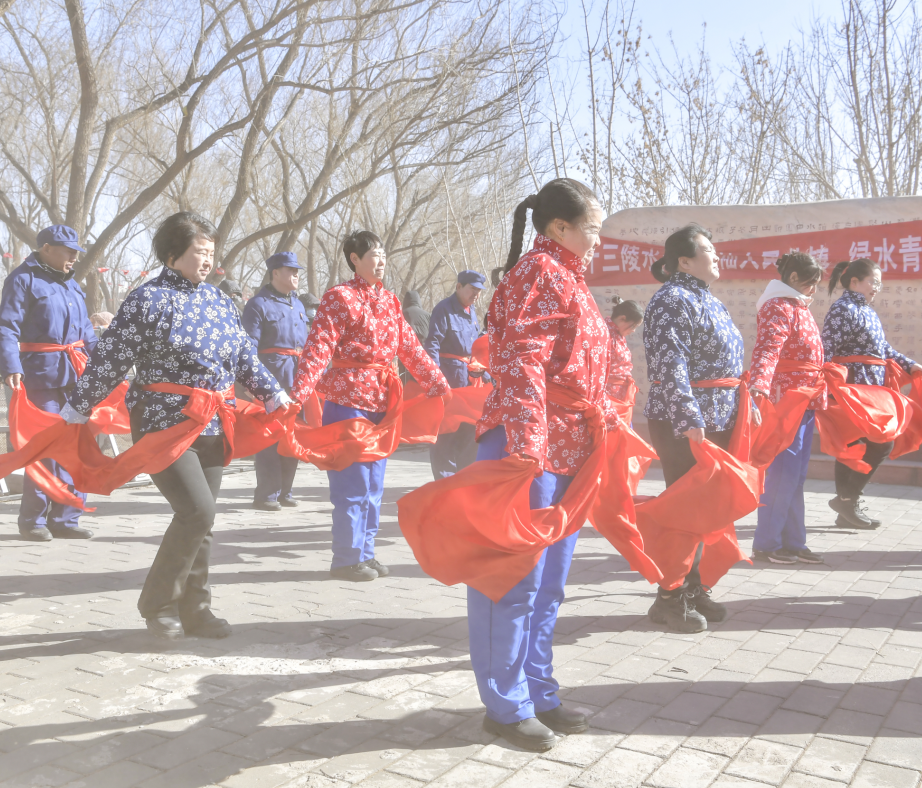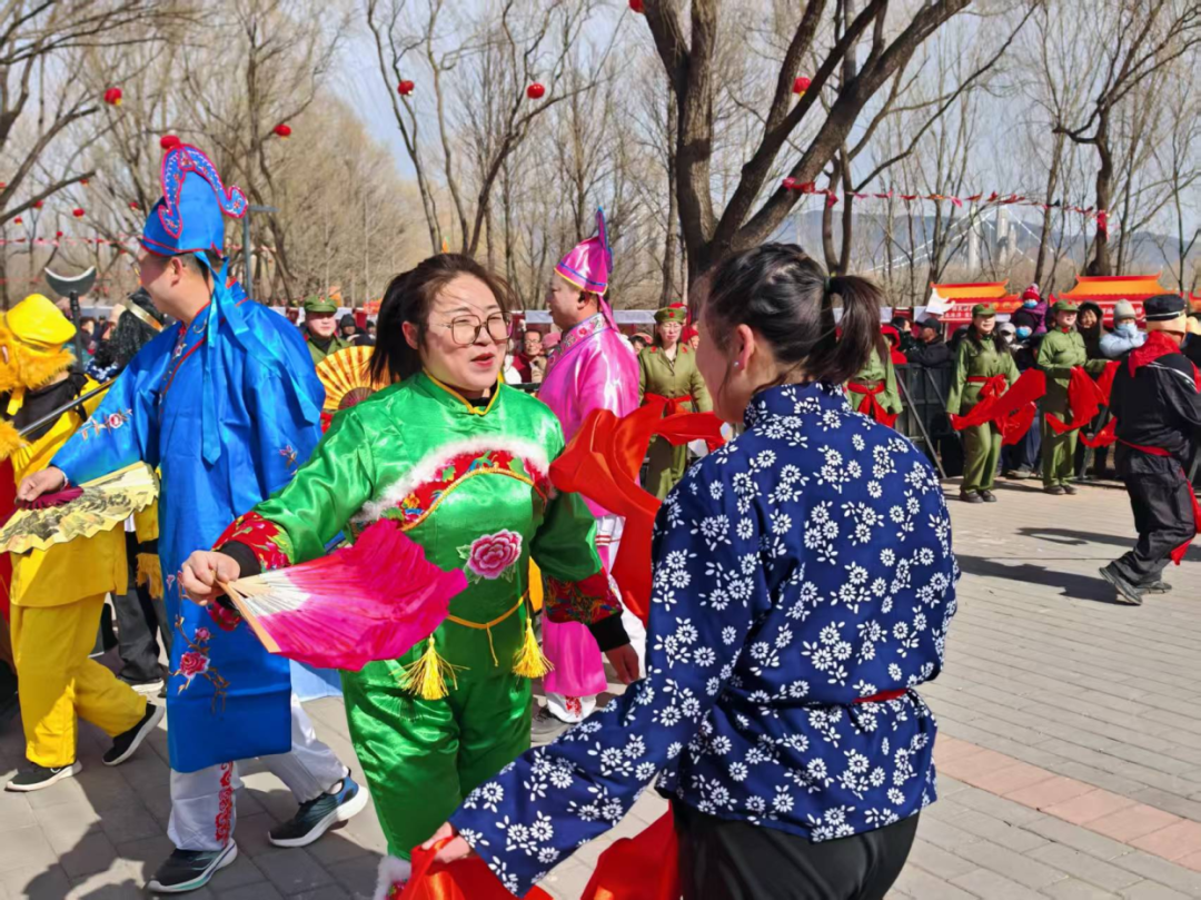 随后,经典舞蹈《大海航行靠舵手》激昂上演,演员们精神抖擞、舞步矫健,展现出新时代村民昂扬向上的精神风貌,唤起中老年观众的时代记忆。喜庆的扭秧歌表演将氛围推向高潮,彩扇飞舞、红绸飘扬,演员们神采飞扬、舞步灵动,队伍时而如长龙蜿蜒,时而似彩蝶飞舞,庙会现场化作一片欢乐的海洋。