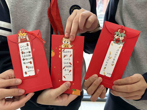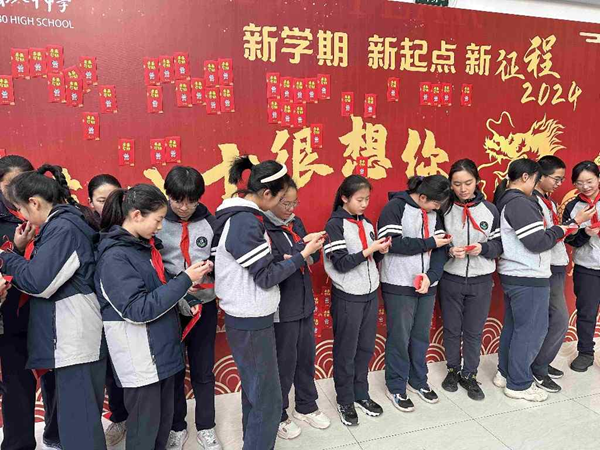走进八十中学北校区,校园里满是喜迎孩子们回归校园的热情和温暖。校园内一面巨大的“开学红包”墙格外引人注目,同学们兴奋地随机取下一个精美的“开学红包”。打开红包,里面是一张寓意吉祥的小卡片,每张小卡片上都写有一位老师对学生的新学期寄语,传递着对学生们的期望与鼓励。