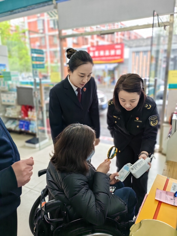 在辖区的一家药店内,无障碍环境监督体验员徐女士乘坐轮椅,轻松来往于货架之间,对药品的选取和相关服务进行了全面体验。