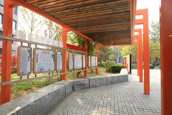 走进中医药文化园东部记者看到,原有廊架增设了一系列中医药文化宣传栏,介绍中医药领域名人名家的生平事迹、学术贡献以及中医药文化知识,居民们通过精美的插图和详细的解说,可以与这些不同时代的医学巨匠进行跨越时空的对话。在廊架端头,还设置了一面以温暖橙色为主色调的三角体互动景墙,展示中医药名家介绍、养生诀窍、中医故事,幕墙上展示有各类药材的图片,最右端还设有可转动的球体,提高了中医药文化学习体验的趣味性,让踏入公园的居民在轻松愉快的氛围中感受到中医药文化的独特魅力。