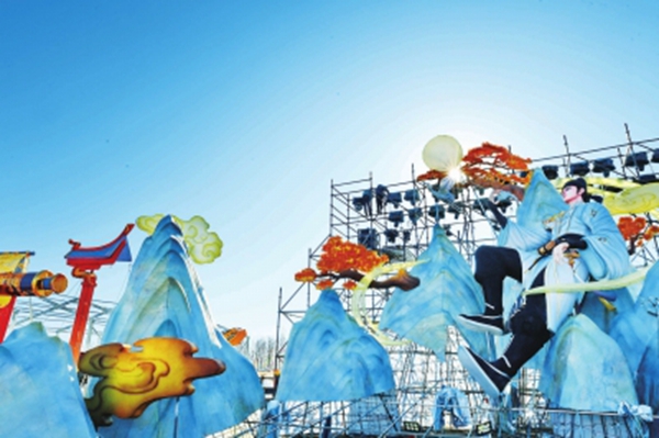 现场,有的师傅穿着厚厚的工作服,戴着帆布手套,正将仙鹤、祥云等配饰灯组焊在李白抬头望月的方向。还有的师傅正将深浅不一的蓝色布匹套粘在山峦骨架的外部。