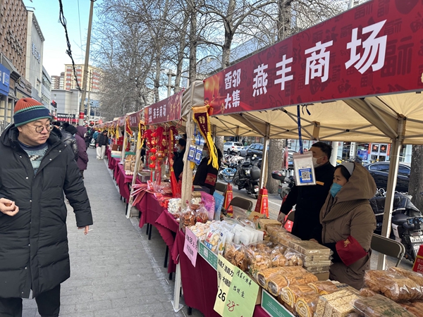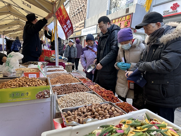在左家庄西街,从香河园地区文化中心一直延伸至燕丰商场的道路西侧,43家商户整齐排列,摊位上的年货琳琅满目,令人目不暇接。酱肉、蒜肠、腊肉等肉制品色泽诱人;酱豆腐、韭菜花等调味品,为市民餐桌增添多样滋味;山楂糕、糖火烧、牛舌饼、咯吱盒等特色小吃,勾起了大家的食欲;对联福字、锅碗瓢盆、蒜臼子、放大镜等日用百货也一应俱全。