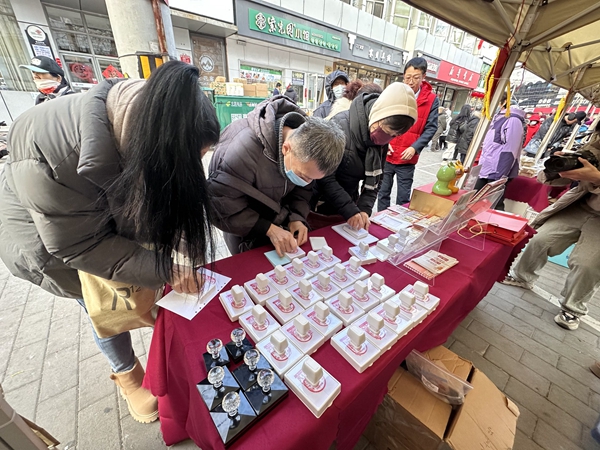 “邮储银行”的摊位前围满了人,大家正排队等着盖章。工作人员带来了60多枚印章,印章主题丰富多样,涵盖省份、生肖、春晚、香河园地区等特色主题;其中套色印章更是别具一格,吸引众多市民前来“打卡”。
