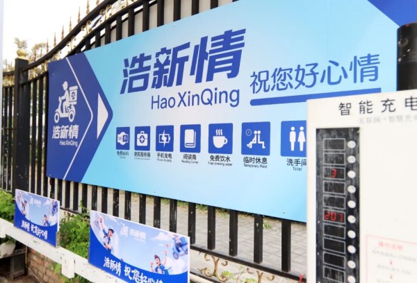 不仅如此,浩华文创园还联合园区内多家友好商户,在店外搭建起带遮阳伞的休息区,摆放好简易桌椅和货架,这里俨然成了骑手们的“露天食堂”,解决了他们吃饭难的问题。针对骑手们电动车“停车乱、充电难”的老难题,园区在西门、东门专门划出8个骑士专属停车位,并安装专用充电桩,地面醒目的标识确保“专位专用”,彻底打消了骑手们的顾虑。