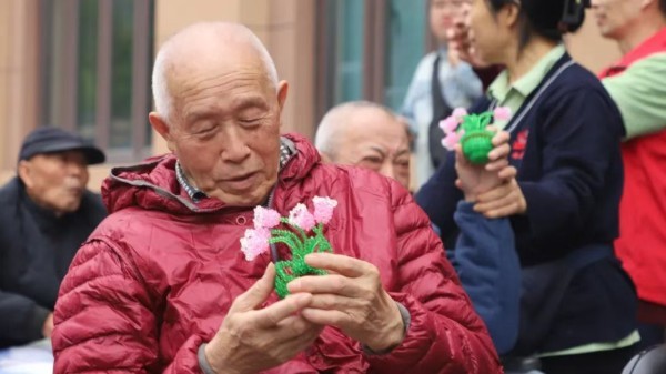 温情环节同样动人。社区“青禾社”的孩子们手捧亲手编织的铃兰花,专程送到朝阳区将台地区养老服务中心的老人手中。铃兰花象征“幸福到家”,孩子们稚嫩的问候与真挚的笑容,不仅传递了社区对老年群体的关怀,更勾勒出将台地区代际和谐、邻里和睦的美好画面。