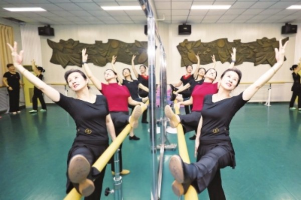 晚上6点不到,朝阳区职工大学(社区学院)的舞蹈教室内就挤满了人。20多位身着黑色舞蹈服的阿姨们,有的在压腿杆上进行腿部拉伸,有的对着镜子调整仪态,有的认真做着肩部环绕运动,全面激活自己的身体。