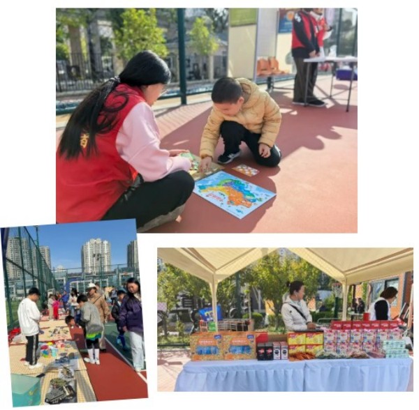 与竞技区的热血氛围相映成趣,市集区以“儿童友好+购物餐饮”为主题,营造出热闹温馨的休闲场景。辖区企业代表与参与跳蚤市场的居民精心布置摊位,整齐排列的货架搭配遮阳棚,汇集了特色美食、亲子好物等丰富品类,打造出“可观、可购、可吃、可玩”的沉浸式体验空间。市集不仅填补了赛事间隙的休闲空白,更成为邻里交流互动的重要平台,让居民在运动之余感受社区温情,进一步提升了活动的参与感与趣味性。