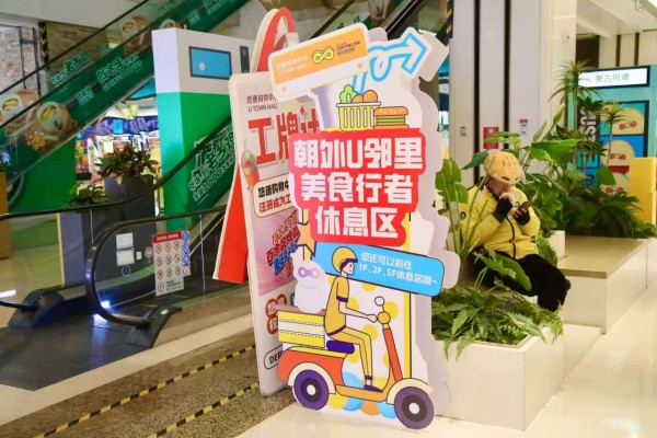 这盏灯,首先照亮了一方可以安心歇脚的物理空间。作为朝外街道重要的商业体之一,悠唐购物中心外卖点单需求巨大,仅美团悠唐站一个站点每日的订单量就能达到3500单,平均每名骑手在悠唐购物中心跑30至50单不等,近百名骑手平均每人每天都要在这里停留至少15分钟。在商场地下一层的黄金位置,随着“朝外U邻里美食行者休息区”的标识指引,可以看到一片绿意盎然的空间,身着各色工服的外卖骑手正坐在里面休息,享受着忙碌间隙的悠然片刻。区域能够供给20到30人休息,配置了桌椅和充电宝等必需品,桌面上张贴着暖“新”提示,周边电子屏滚动播放着朝外U邻里服务地图和优惠服务清单等。这里紧邻扶梯和餐饮商户,是商场人流量最大的黄金位置之一,在这样一个寸土寸金的商圈核心地带,“美食行者休息区”取代了原本可以产生“租金收益”的商业摊位,这无疑是一个令人意外的决定。